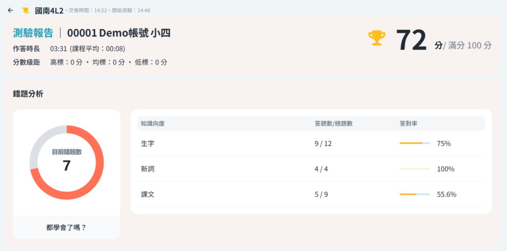 自動批改作答,提供知識點分析與題目解析,幫助學生理解錯誤原因,並針對弱點組成複習題組,有效補足知識漏洞。