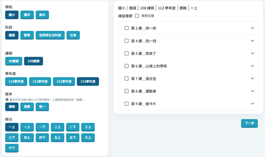 針對學制、科目、版本、冊次、章節均可依照需求自行設定,可自行組卷進行強化練習,提高學習成效。有效建立閱讀、理解、解題能力,為學科打好學習基礎。